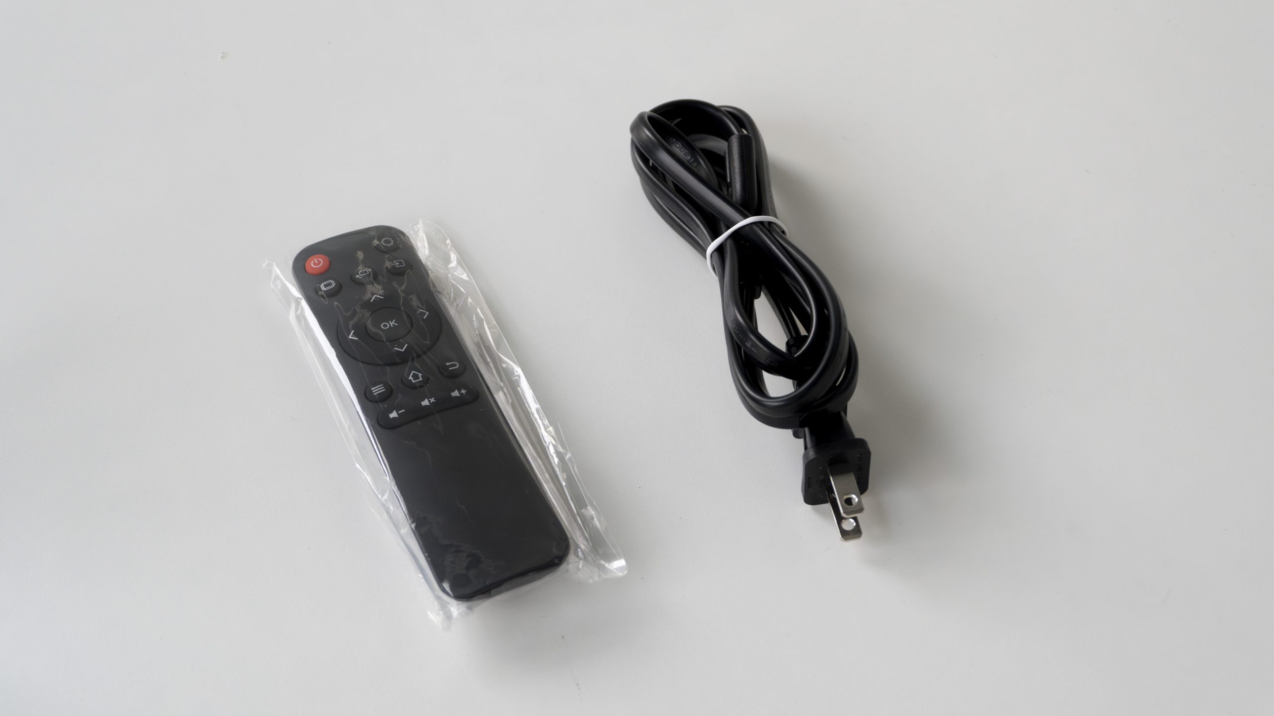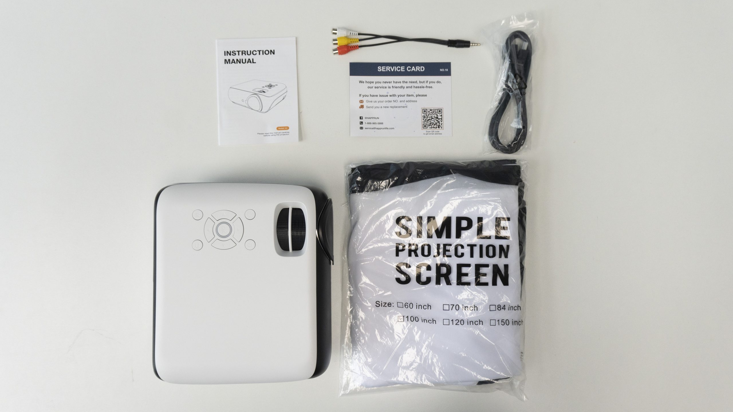 Open the package we got the H1 projector body, a manual, a service card, and surprisingly, a 100-inch simple projection screen. And a remote control is of course included. In terms of cables, the brand provides us with a power cable, an HDMI video cable, and an extra component cable (CVBS) that allows you to connect the projector to some of the more old-fashioned multimedia devices, such as a Wii console.