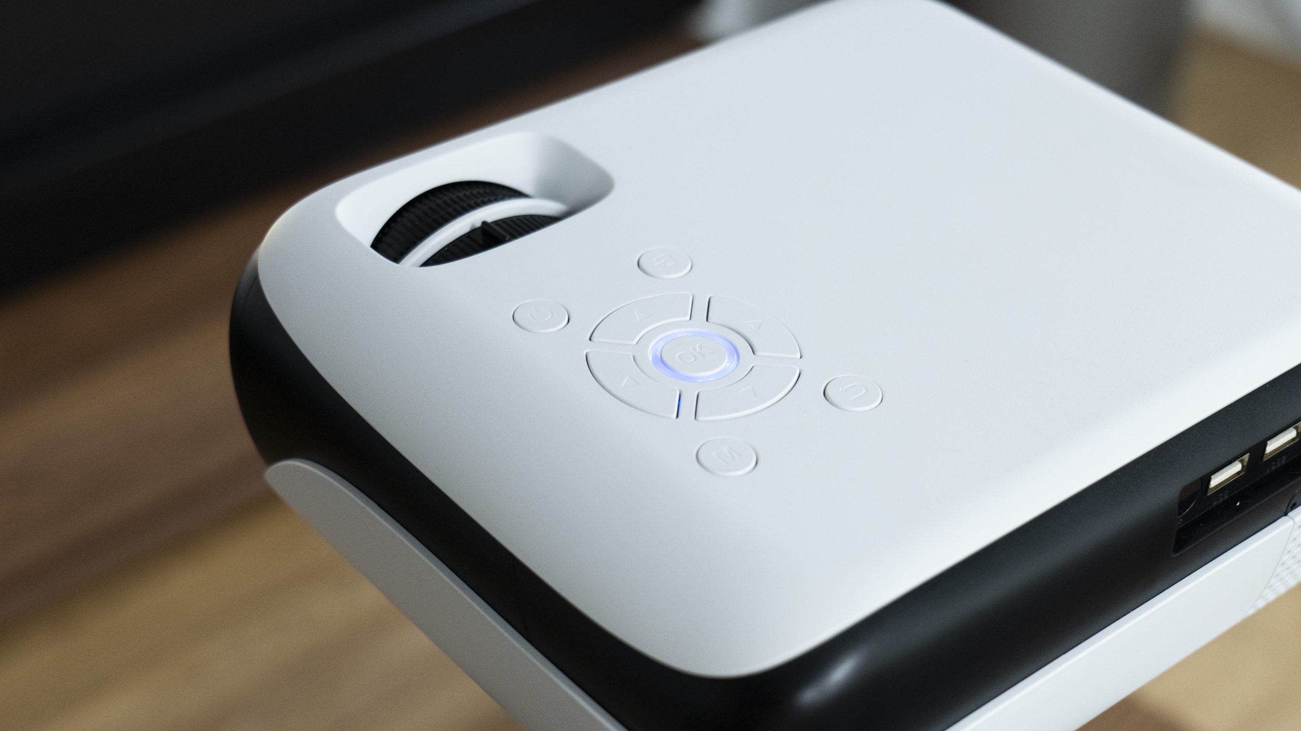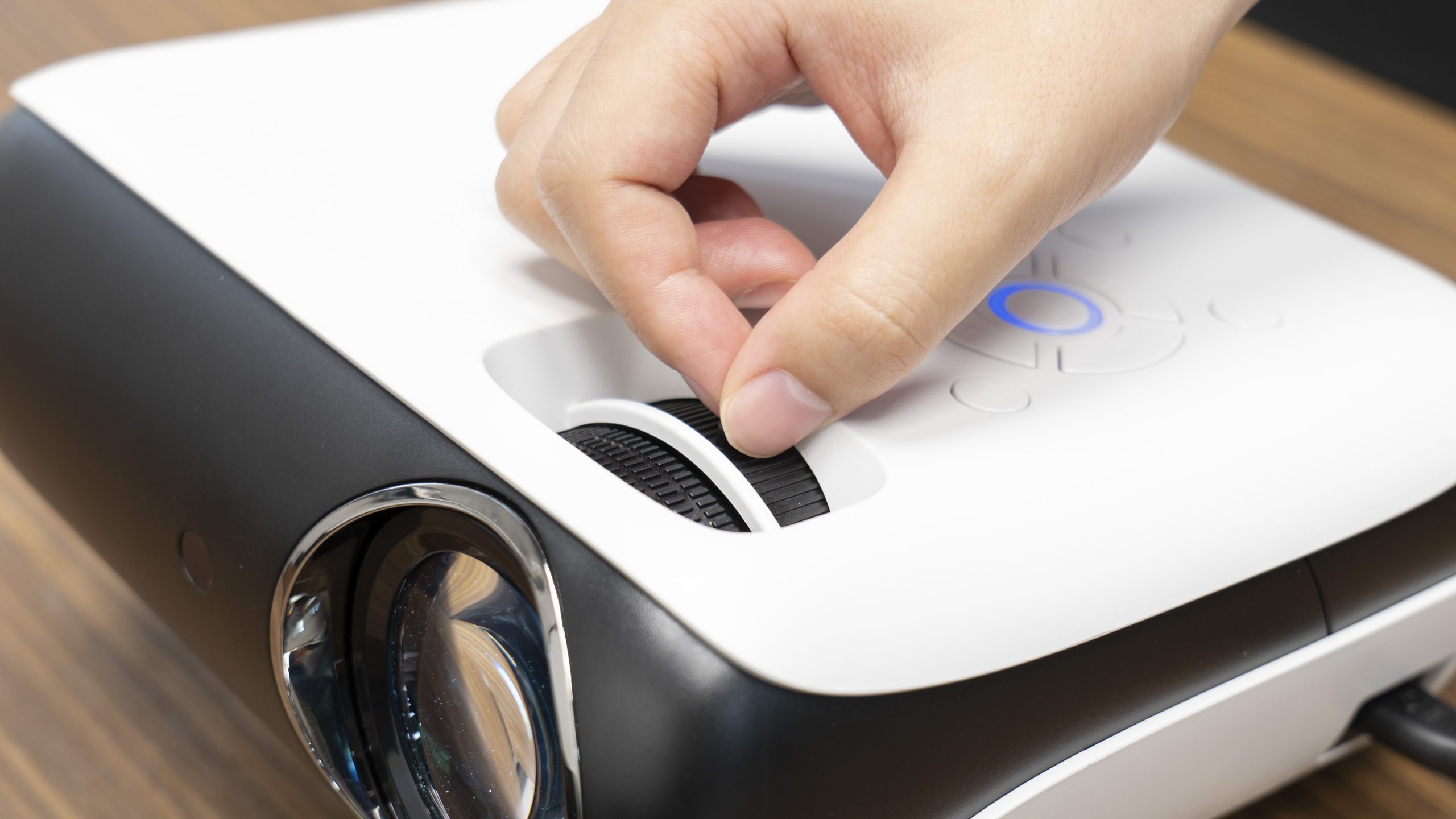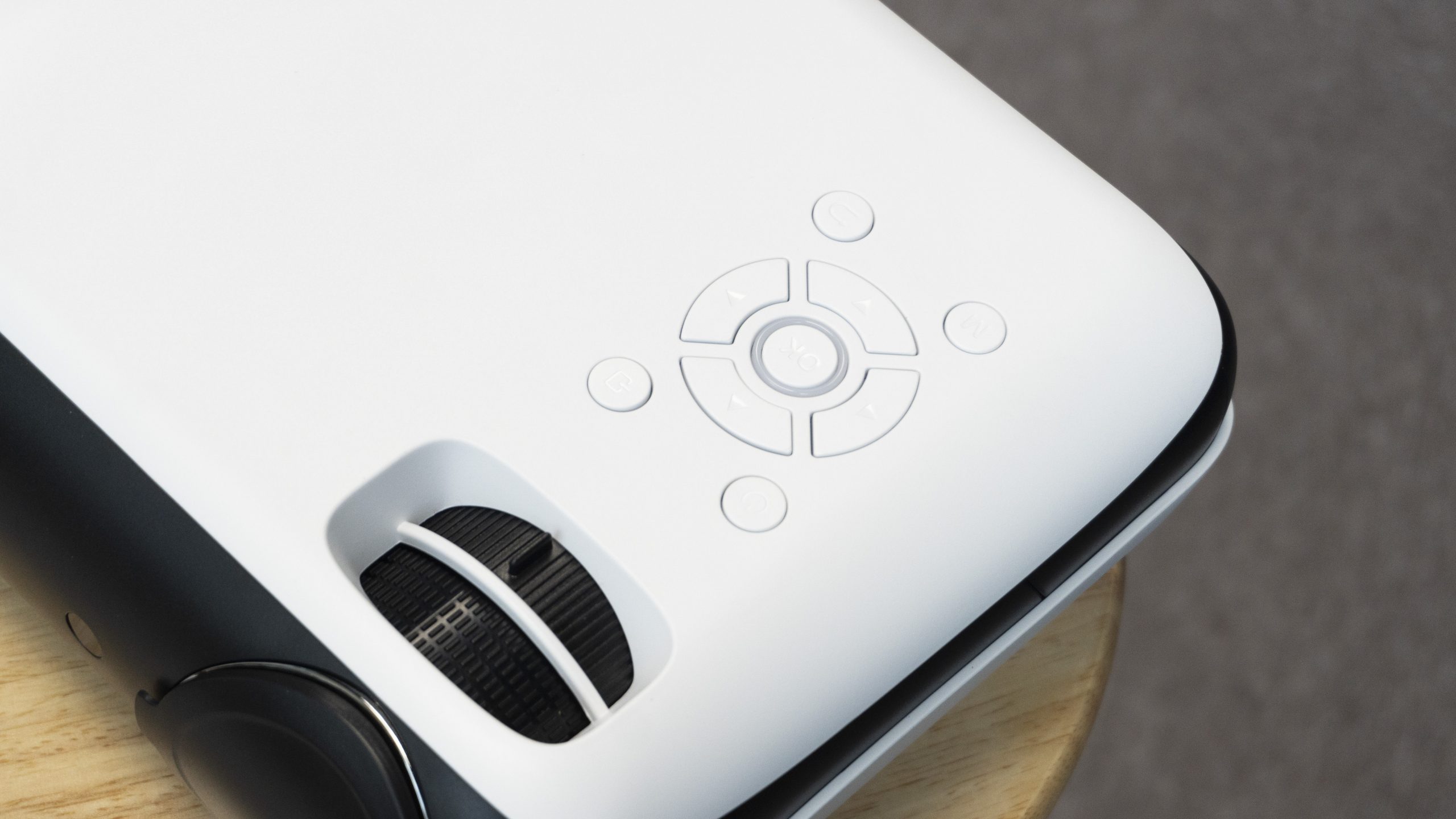 On the left side of the top, we can see all the control buttons and the wheels used to adjust the focus and keystone respectively. There are many mid-range to high-end projectors today that do away with physical buttons, but I think these buttons are still a great bonus for a good user experience. At least if you forget to take the remote control with you when you go out, you can still use the buttons on the machine for various operations.