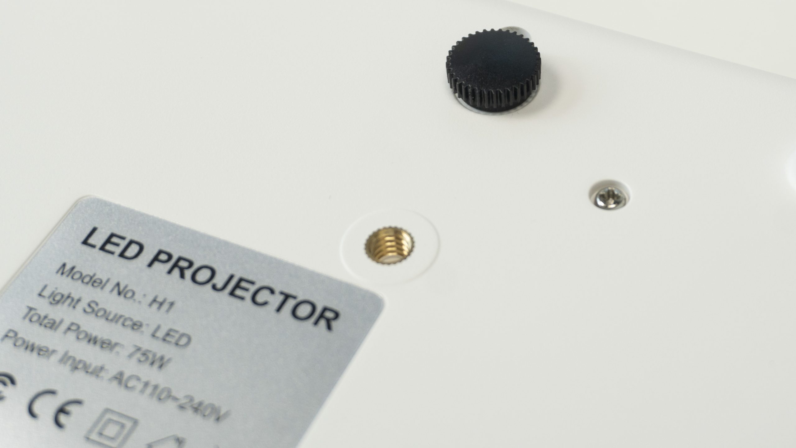 At the bottom of the projector we can see a 1/4″ screw hole that allows you to mount the machine to a tripod or any compatible stand device. And there is a little stand for height adjustment, so if you find the image position is too low on a flat surface, you can use it to easily adjust the elevation angle of the projector.
