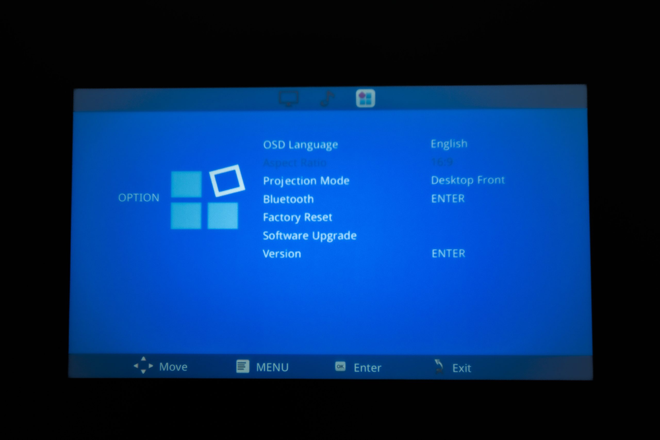 In the settings menu, we can adjust the projected image with many detailed options, and we can also adjust the reverb of treble and bass in the sound options. In an additional menu, we can view some information about the projector and change some system settings or connect other compatible devices via Bluetooth.