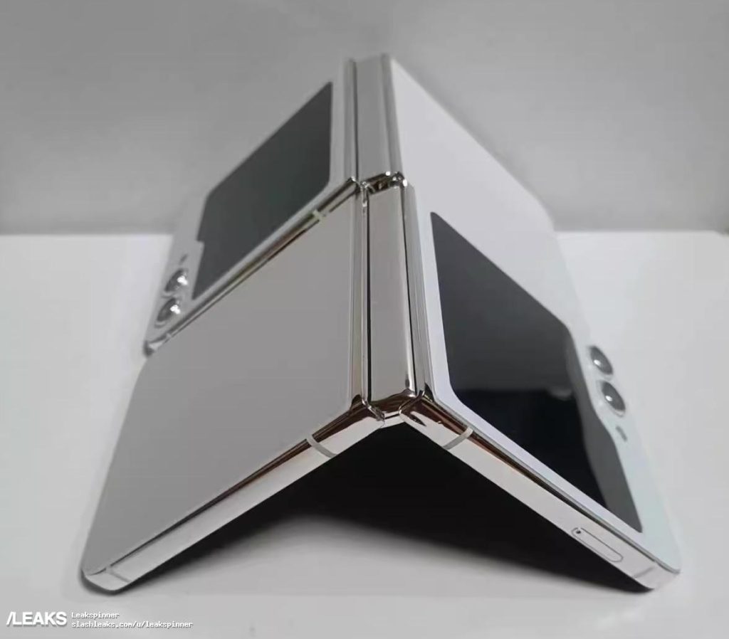 A recent post on Slashleaks features images and a brief video showcasing the dummy unit of the Galaxy Z Flip 5. In the images, you can see a larger folder icon-shaped cover display on the outside, accompanied by two camera modules. The rest of the design seems to be similar to last year’s model, from the fingerprint sensor to the hinge.