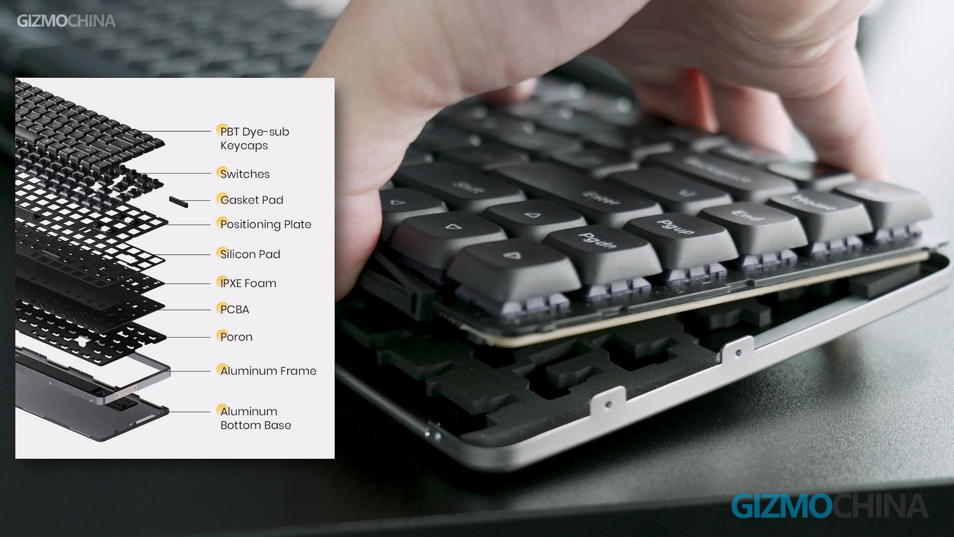 In addition to POM switches, there’s another thing to enhance the typing experience: the Gasket mount, can you imagine that on a low-profile keyboard? By disassembling it, we can also tell that it’s filled with all kinds of sound-absorbing materials. So as you can also hear, the typing sound is just barely like cavity tone, the thock of this keyboard is something I didn’t expect.