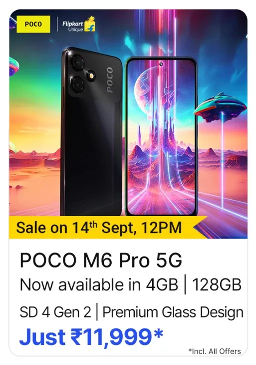 The POCO M6 Pro 5G is now available in 4GB RAM and 128GB storage configuration. This means that the base variant that was announced during launch now gets double the storage capacity although the RAM remains the same. The newly launched 4GB + 128GB option is priced at Rs 11.999. It will be available for purchase starting September 14 at 12 noon via Flipkart. ICICI Bank cardholders can avail Rs 1,000 instant discount on the purchase.