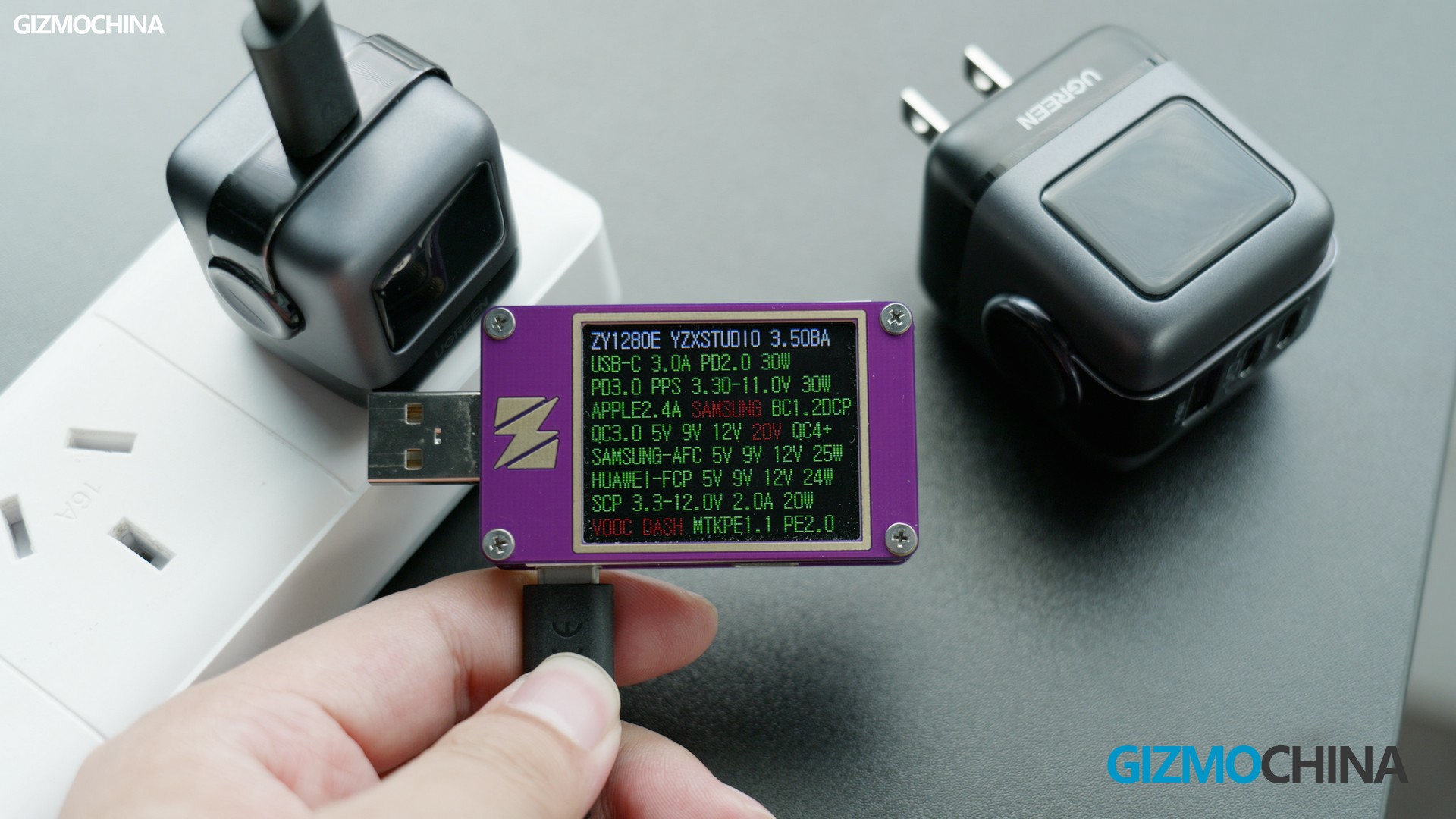 First, this RG 30W charger, as you can see there is a single USB-C port on it, and it has a 30W max output, after connecting to the tester, we can see that it supports many charging protocols, I have put them on the screen so you can read.