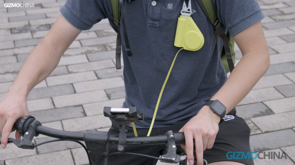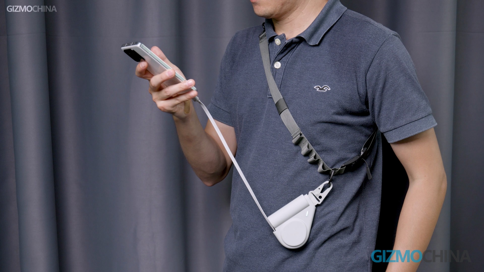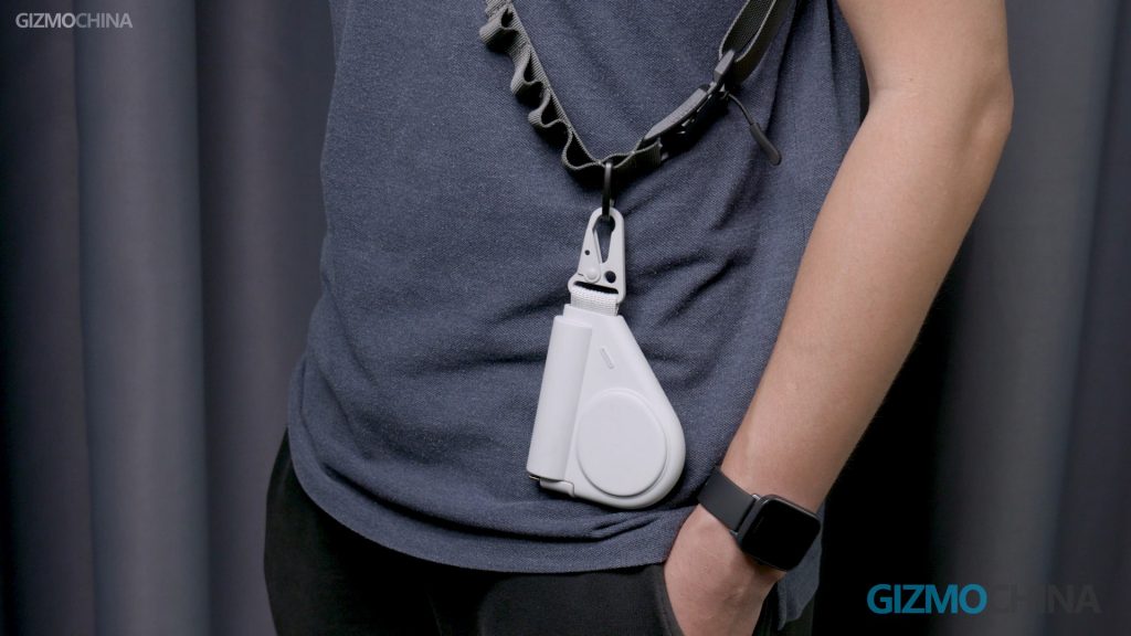 Wait, it gets even better, there is a shoulder strap prepared for you. If you only need your phone and power bank with you, you can achieve that by using this item. So it really frees your hand entirely, what a genius solution! When it’s hooked here, it looks very versatile, and since it has a unique shape and the colors are bright, it’s like a fashionable item more than just a power bank.