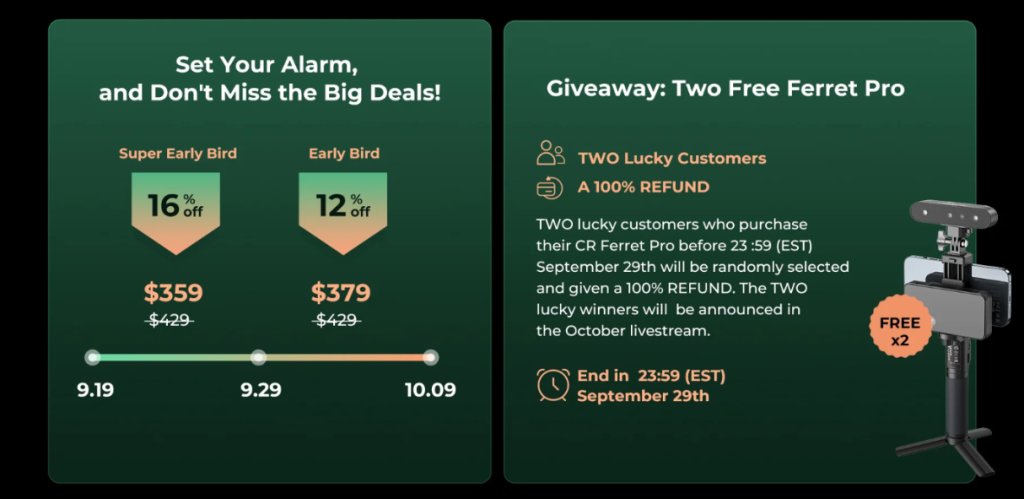The company is also giving a lucky draw offer. If you purchase your CR Ferret Pro before 23:59(EST) on September 29th, you could be one of two fortunate customers selected for a 100% Refund. The two lucky winners will be announced during the October livestream.