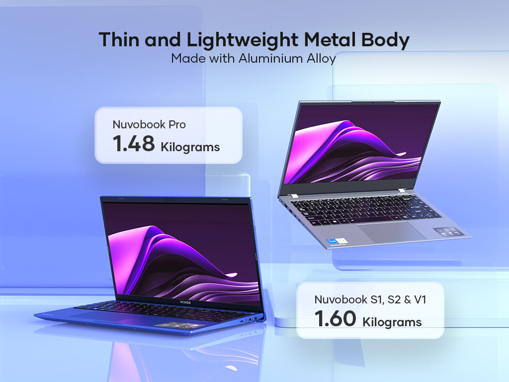 The Nuvobooks have a lightweight design featuring an aluminium build and weigh around 1.60kg. The Wings laptops can be bought in multiple colors like blue, green, red, and silver.