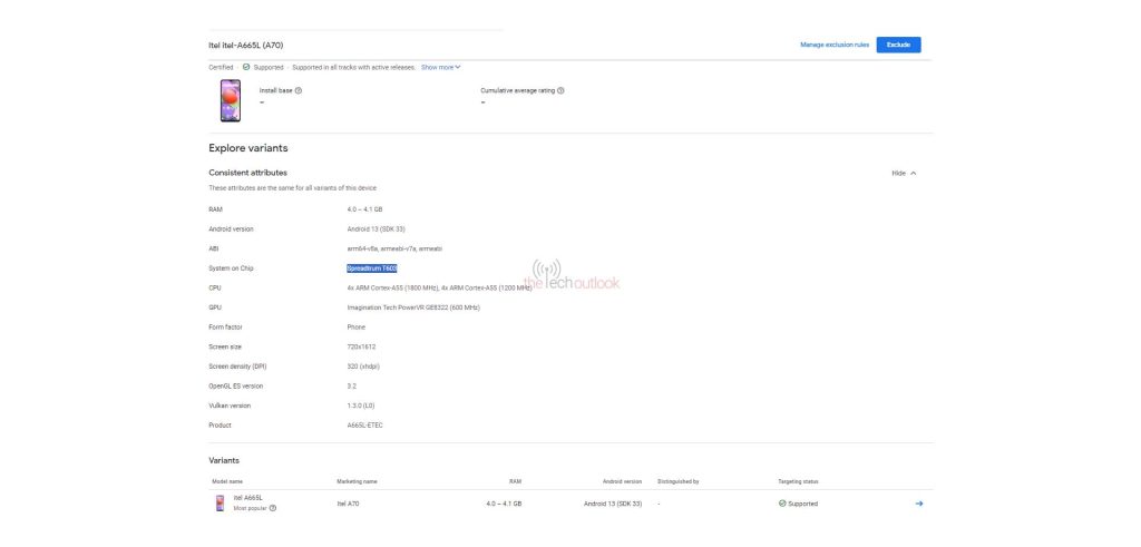 Under the hood, the iTel A70 is listed with a Spreadtrum T603 processor comprising of four Cortex-A55 cores at 1.8GHz and another four Cortex-A55 cores ticking at 1.2GHz. There is a PowerVR GE8322 GPU onboard. As per the Play Console certification, the smartphone will pack 4GB RAM and shiip with Android 13 OS out of the box.