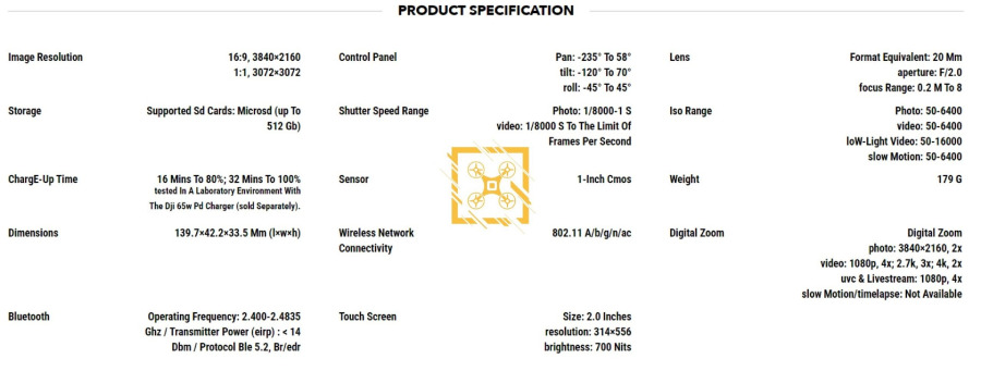 The leaked spec sheet also reveals the display details of the gimbal. According to it, the Pocket 3 will feature a larger rotating display than its predecessor, but it is still relatively small at 2 inches. The rotating design should make it easier to use the camera for selfies and other creative shots. Also, the display has a resolution of 556 x 314 pixels and a peak brightness of 700 nits.