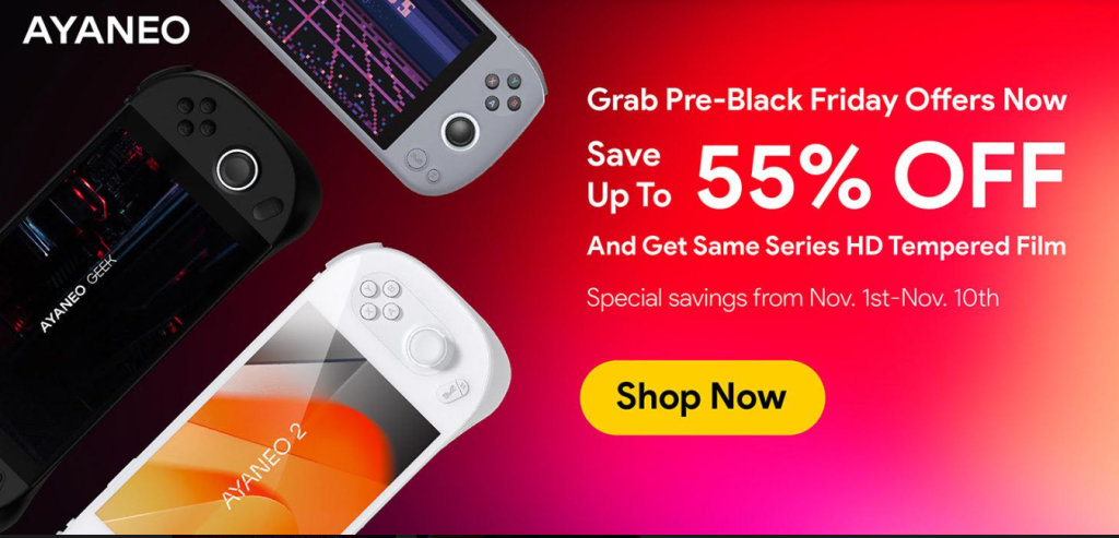 AYANEO is now offering an exciting Pre-Black Friday deal. You can get an incredible discount of up to 55% on a variety of products under this deal. This exclusive offer is valid until November 10th. So let us explore their top-notch lineup and enhance our gaming experience.