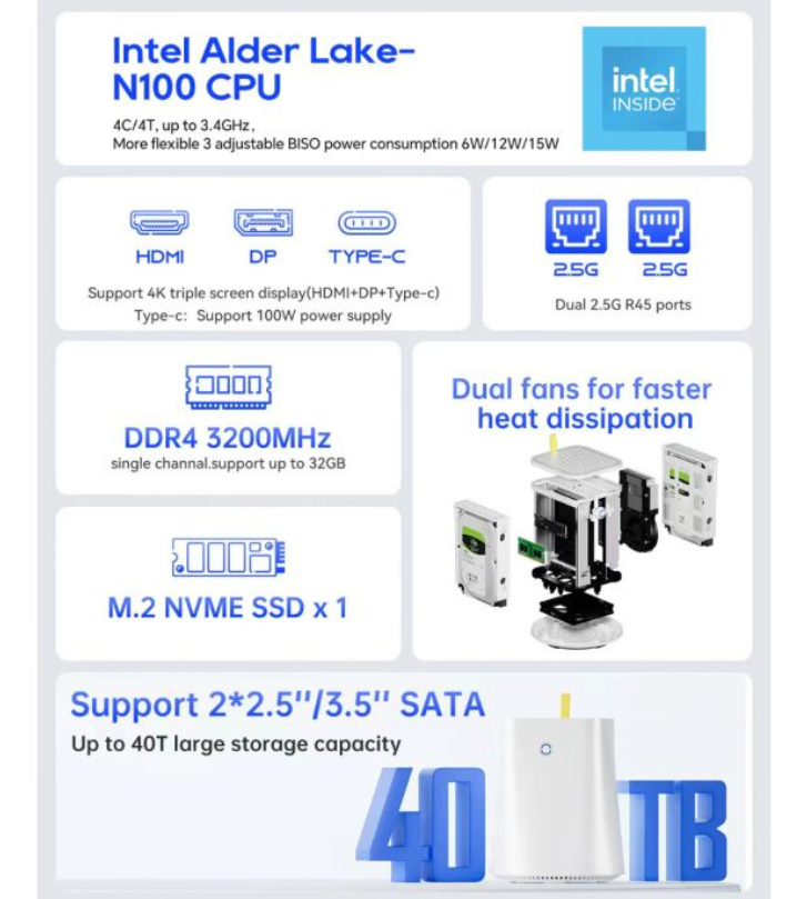 In terms of memory, the mini PC supports DD R4-3200 (single) and offers versatile storage options with M.2 2280-NVMe x1 and 3.5 SATA x 2 slots. This ensures seamless multitasking and ample space for your files and applications.