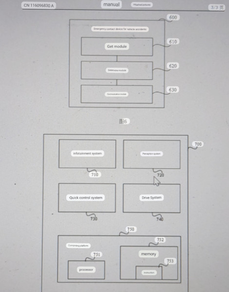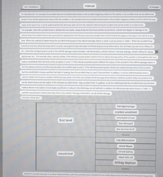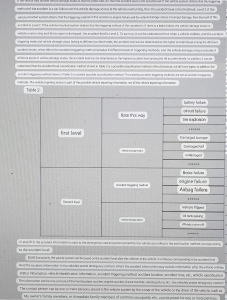 The patent describes a system that uses three modules to assess the severity of an accident: a Get module, a Determine module, and a Communication module. The Get module collects status information about the vehicle, such as battery failure, circuit failure, airbag deployment, and wheel detachment. The Determine module then uses this information to classify the accident as Level 1 or Level 2.