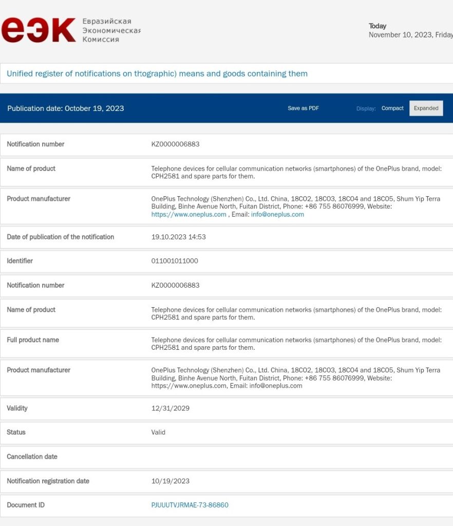 The OnePlus 12 is listed with model number CPH2581 on TDRA certification in the UAE. It also carries the same model number on Russia’s EEC certification website. The listings do not reveal any key details of the device but they do suggests that the smartphone will be launching in those respective countries. We can expect the OnePlus 12 to first debut in the China market before the end of the year.
