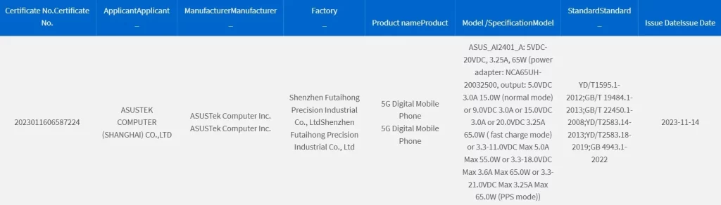 The ASUS ROG Phone 8 Ultimate has been listed on 3C certification with the model number ASUS_AI2401_A. This is the same as the Geekbench listing. The latest 3C certification reveals that the device will support 65W fast charging which is the same as its predecessor. Additionally, the device will also come with 5G connectivity. The listing does not reveal any further information.