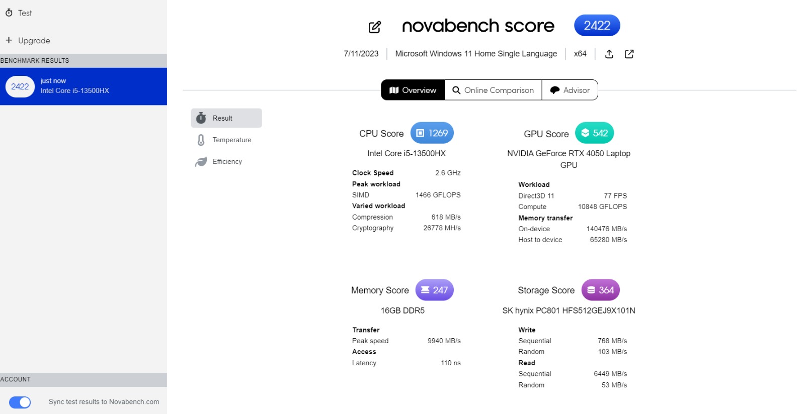 The Victus 16 has two RAM slots, both occupied by a pair of 8 GB DDR5-4800Hz RAM modules. In terms of storage, the device comes with 512 GB PCIe Gen 4 NVMe M.2 SSD storage and is preloaded with Windows 11 Home. Under general use, the laptop’s dual-fan cooling system operates silently. The fan noise increases during intensive gaming, but it remains unobtrusive. The Omen Gaming Hub app can be used for various kinds of customization, such as keyboard lighting, monitor performance, and game optimizations including overclocking, power profiles, fan speed, network booster, and more.