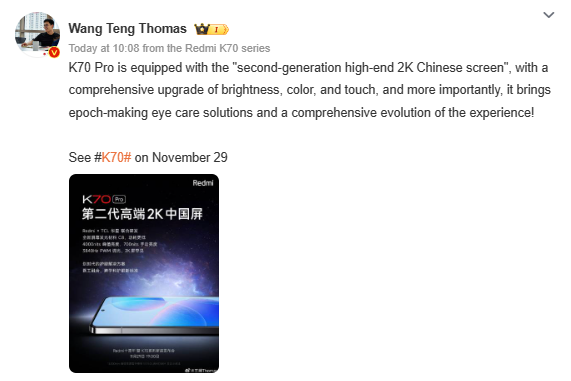 Xiaomi’s Product Director, Wang Teng Thomas, reported today on Weibo that the launch event for the upcoming Redmi K70 Pro is scheduled for November 29, marking the 10th anniversary of Redmi. We are just hours away from the official release at this point.