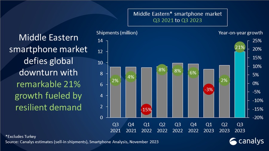 This year, there has been a decline in the number of smartphones shipped around the world. Sales of smartphones have been falling in every major market, including those in North America, Europe, and Southeast Asia. Following the ongoing festive sales, there’s a slight chance of improvement, but the overall year remained sluggish for global shipments. Surprisingly, the Middle Eastern smartphone market defied the global smartphone market signals and registered a 21% annual growth in Q3 2023.