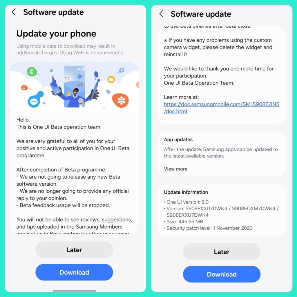 The new update is currently seeding only for the Galaxy S22 Ultra beta users with build versions S908EXXU7DWK4/ S908EOXM7DWK4/ S908EXXU7DWK4. It weighs only 446MB in Size and brings the November 2023 Security patch. The update will soon arrive for the non-beta users in India.