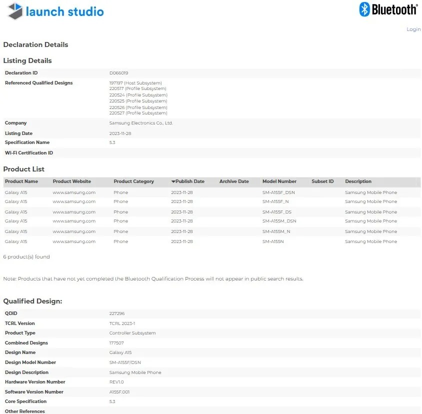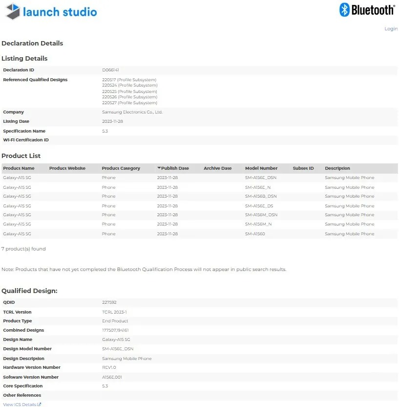 The 5G smartphone bearing model numbers SM-AISGE_DSN, SM-AISGE_N, SM-ASSB_DSN, SM-ASSE_DS, SM-AISEM_DSN, SM-AISEM_N, and SM-AISSO and 4G variant with model codes SM-AISSF_DSN, SM-AISSE_N, SM-4155FDS, SM-AISSM_DSN, SM-AISSM.N have surfaced on the Bluetooth SIG. Both the Galaxy A15 4G and 5G models embeds Bluetooth 5.3.