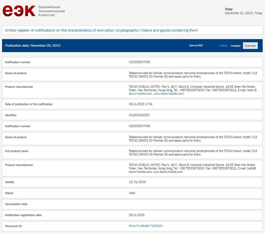 Tecno Camon 30 Premier 5G EEC & Bluetooth SIG