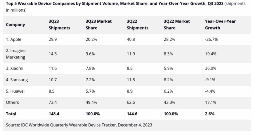 Apple retained its position as the top wearable device vendor with 29.9 million units shipped in Q3 2023, securing a 20.2% market share. However, the company’s year-over-year growth declined by 26.7%.