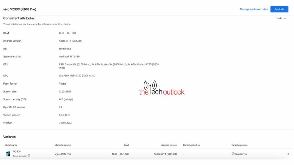 The Vivo X100 Pro has a model number V2309 on the Google Play Console. The certification listing mentions a MediaTek MT6989 system on chip and it comprises four Cortex-X4 cores at 3.2GHz, three Cortex-X4 at 2.8GHz, and four Cortex-A720 ticking at 2GHz. The chipset configuration corresponds to the Dimensity 9300 processor. The smartphone will pack 16GB RAM onboard and it will ship with Android 14 OS out of the box.