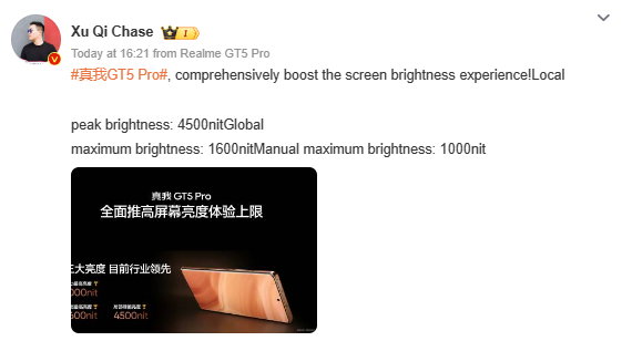 In what seems like a response, Realme‘s Vice President, Xu Qi, has proudly mentioned the brightness specifications of the Realme GT5 Pro on Weibo. According to Xu Qi, the Realme GT5 Pro stands out in terms of “local peak brightness, global maximum brightness, and manual maximum brightness”. Notably, the manual maximum brightness of the Realme GT5 Pro reaches up to 1000 nits, which is higher than both the OnePlus 12’s 600 nits and Redmi K70 Pro’s 700 nits rating. You can see the brightness ratings of the Realme GT5 Pro in the screenshot below.