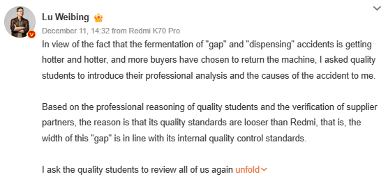 The entire “Xiaomi OnePlus screen brightness controversy” initiated when Lu Weibing, a key figure at Xiaomi, called for a professional analysis of recent incidents related to the “gap” and “dispensing” in new devices, with many incidents reportedly involving OnePlus 12 units. Based on the analysis, he reasoned that the quality standards of Redmi is higher than the industry. He further mentioned “Quality is the lifeblood of Redmi, and there can be no slackness and luck.”