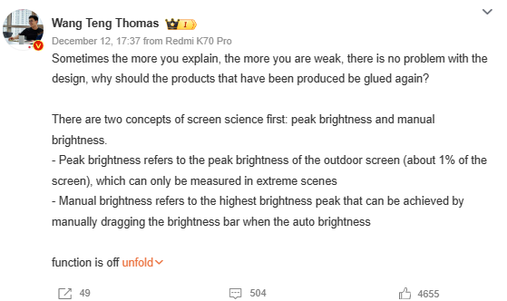 Wang Teng, General Manager of the Redmi market and Redmi brand spokesman, added to the discourse by explaining the concept of ‘manual brightness’, emphasizing its relevance to daily use. Wang Teng claimed that the Redmi K70 Pro achieves a maximum manual brightness of 700 nits, surpassing the new OnePlus 12, which reportedly reaches only 600 nits.