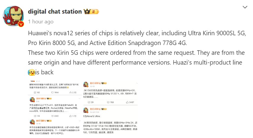 As per leaks, the Huawei Nova 12 Lite or Vitality Edition will be equipped with a Snapdragon 778 4G processor. Meanwhile, the Nova 12 Pro is said to be powered by the new Kirin 8000 SoC with support for 5G connectivity. This also got confirmed in an alleged leaked live image that surfaced earlier today. The top-end Nova 12 Ultra will reportedly feature the Kirin 9000 SL chipset onboard. It has not powered any Huawei phone before but speculations hint at an underclocked version of the Kirin 9000S.