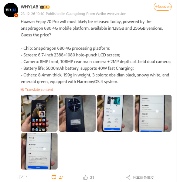 Shared by WhyLab on Weibo, the leak offers a first glimpse of the Enjoy 70 Pro, showcasing both its front and back in a bunch of hands-on photos, along with most of its specs.