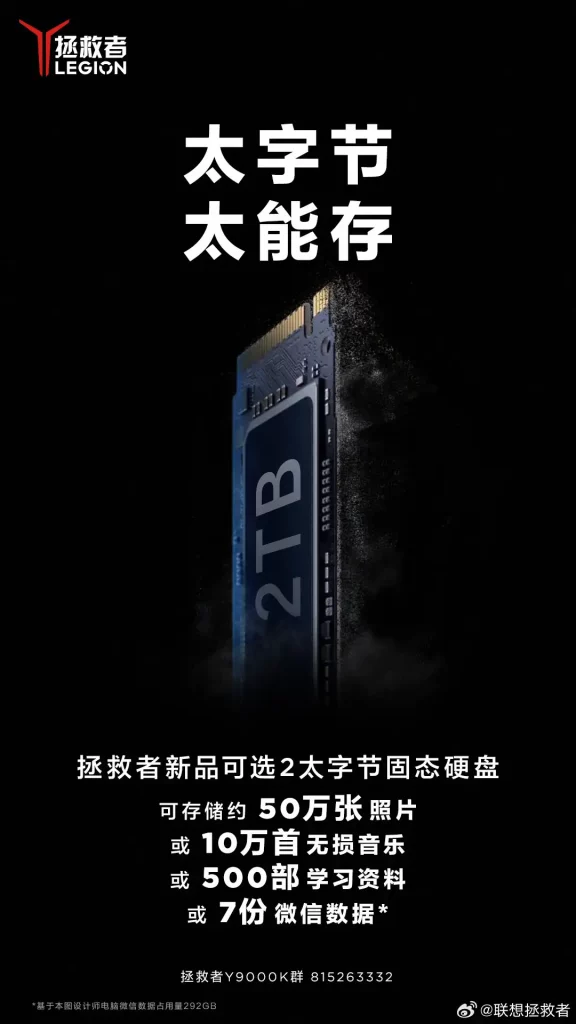 Additionally, Lenovo mentions an optional 2TB SSD for the new Legion Y9000K model, providing users with expanded storage options.