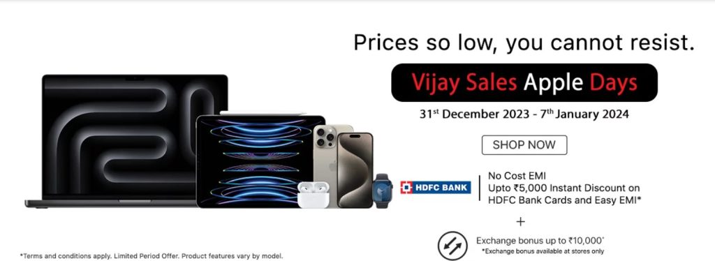 The Apple Days Sale is currently live at Vijay Sales retail stores across the country as well as on their official website. It will end on January 7. During the sale period, the iPhone 15 and 15 Plus are available at starting price tags of Rs 70,990 and Rs 79,820 respectively. This means that compared to their launch price, the discount is nearly Rs 10,000 for the base models. Meanwhile, the iPhone 15 Pro starts at Rs 1,25,900 which is cheaper by Rs 9,000 compared to original price of Rs 1,34,900. On the other hand, the Pro Max can be grabbed from Rs 1,49,240 instead of Rs 1,59,900.