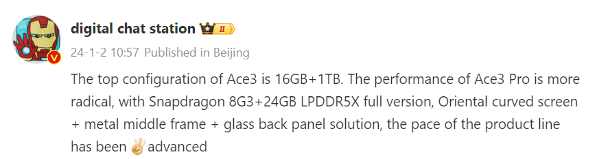 Under the hood, the Ace 3 Pro will feature the Snapdragon 8 Gen 3 chipset and 24 GB of LPDDR5x RAM. While it is not mentioned in the leak, it is likely that the device may offer up to 1 TB of UFS 4.0 storage.
