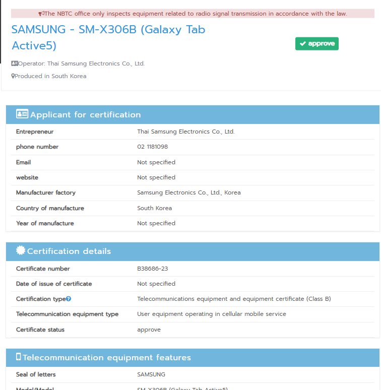 Samsung is nearing the launch of its new rugged tablet, the Galaxy Tab Active 5. The new tablet has already made it to several certification websites, including Singapore’s IMDA, the UAE’s TDRA, and others. Following the past trend, the much-awaited rugged tablet has appeared on Thailand’s NBTC with model code SM-X306B.
