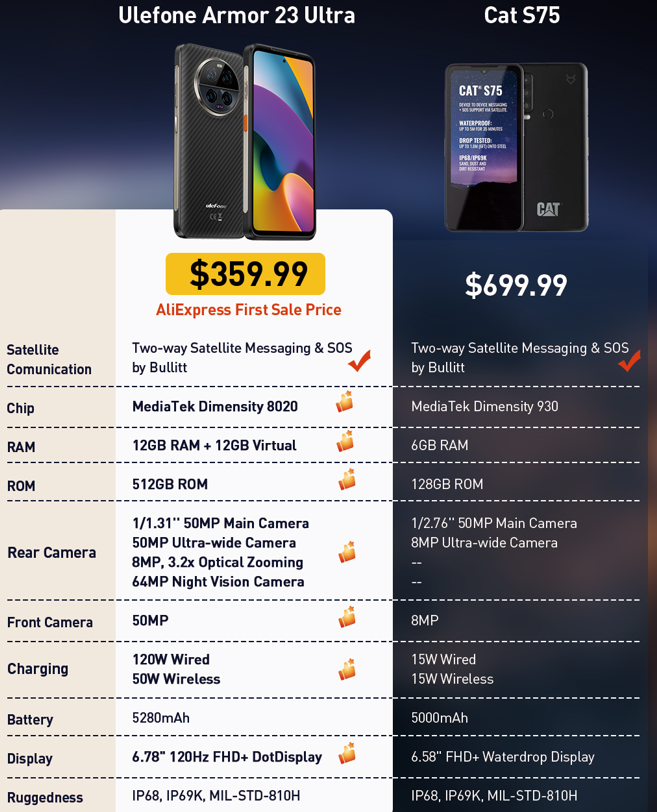 In a head-to-head comparison with the Cat S75, another rugged smartphone supporting two-way satellite messaging, the Ulefone Armor 23 Ultra emerges as the clear winner. The Armor 23 Ultra not only boasts a significantly lower price at $359.99 compared to the Cat S75’s $699 but also outshines its competitor in various aspects.