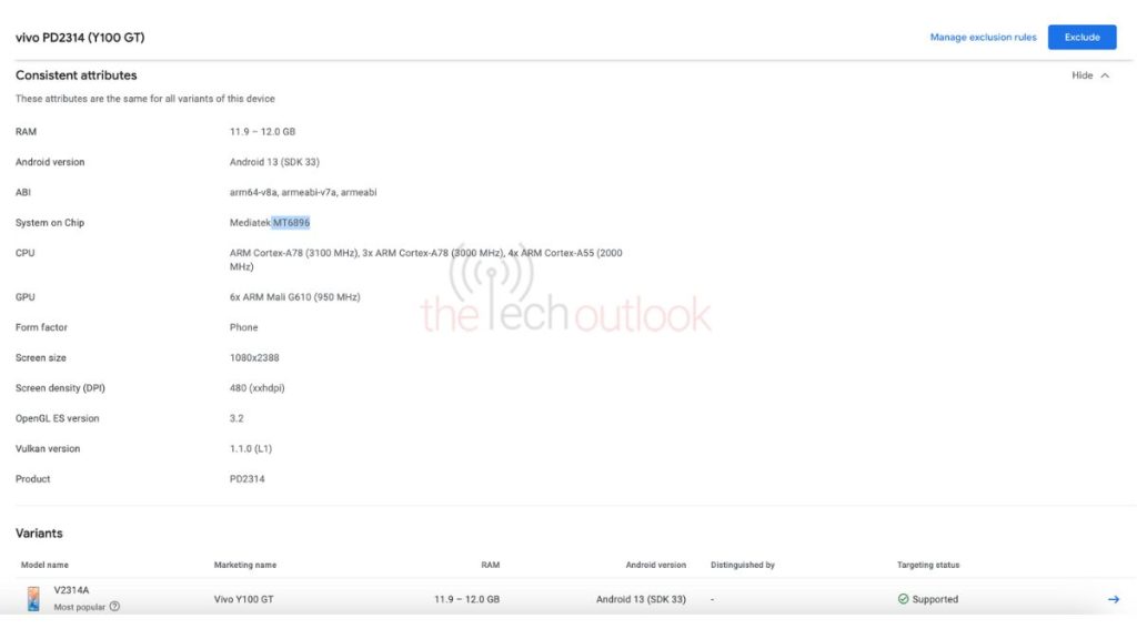As per the listing, the Vivo Y100 GT will be powered by a MediaTek MT6896 processor comprising of a Cortex A78 core clocked at 3.1GHz, three Cortex-A78 cores at 3GHz and four Cortex-A55 cores ticking at 2GHz. It has a Mali-G610 GPU onboard. From the chipset configuration, it’s likely that the processor is Dimensity 8200. The listing reveals 12GB RAM onboard and we can expect more variants at launch. The smartphone will ship with Android 13 OS out of the box.