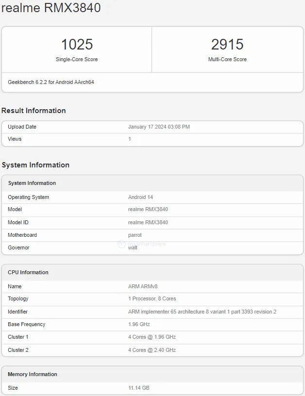 The Realme 12 Pro+ scores 1,025 and 2,915 points in Geekbench’s single-core and multi-core test results.