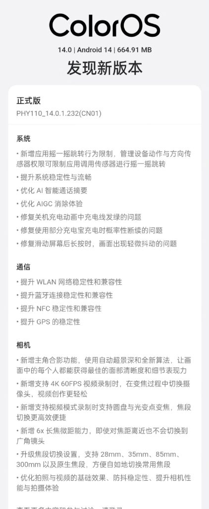 Well, the update on the Oppo Find X7 Ultra carries firmware PHY110 14.0.1.232 (CN01) with plenty of new fixes and improvements. The update weighs 664MB in size. It improves system stability, optimizes AI intelligent call summaries, enhances the AIGC removal experience, and fixes issues related to charging cable animation and intermittent charging using a power bank. Below is the official changelog (translated):