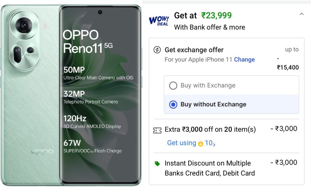 The Reno 11 5G, featuring 8GB RAM and 128GB storage, originally priced at ₹29,999 (~$361), is currently available at a discounted price of ₹23,999 (~$289) on Flipkart. By leveraging a ₹3,000 bank card discount and an additional ₹3,000 off through super coins (redeemable with 10 super coins), you can secure this deal. In case the offer is not visible on the website, you can access it through the Flipkart App.