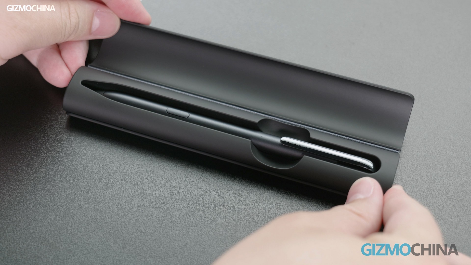 Let’s start with the box in the center. Inside there is a very delicate case that is similar in design to the back cover of the phone. There is also a long case inside that is designed for the stylus. It’s also textured with vegan leather and the lid is magnetic, which really makes the stylus look like a fancy fountain pen.
