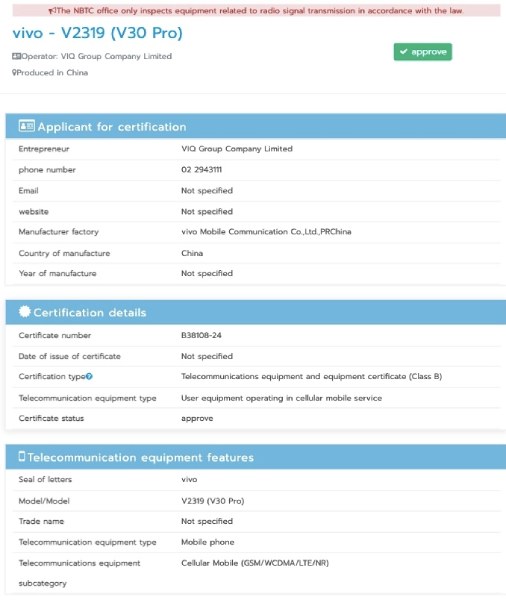 Smartphone manufacturer Vivo will be releasing its V30 series line, including with the V30 Pro in Thailand on February 28th, 2024. Ahead of the launch, the V30 Pro has obtained certification from Thailand’s NBTC.