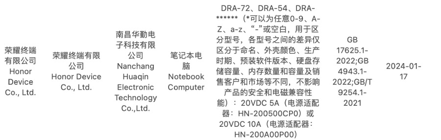 Further information comes from the China Quality Certification Center (CQC) website, where Honor laptops with model numbers DRA-72 and DRA-54 have secured certification. These listings indicate that the laptops will come with either 100W or 200W power adapters.