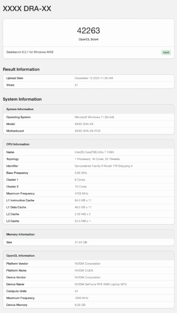 Listed under the model number DRA-XX, the Geekbench listing shows that the MagicBook Pro 16 will boast an Intel Core Ultra 7 155H processor paired with an NVIDIA RTX 4060 graphics card.