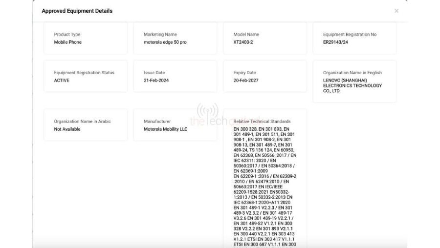 One important update comes from the TDRA certification, which confirmed that the Motorola smartphone with the model number XT2402-2 is the Edge 50 Pro. Although the listing doesn’t provide details on other specifications of the device, it does confirm the official name of the forthcoming phone.