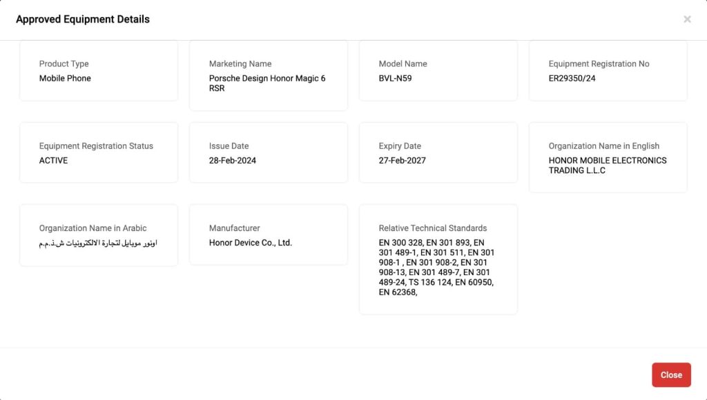 The Honor Magic 6 RSR Porsche Design smartphone is gearing up for its global release soon, having just secured its TDRA certification. This device, with the model number “BVL-N59,” is expected to launch in China in March 2024.