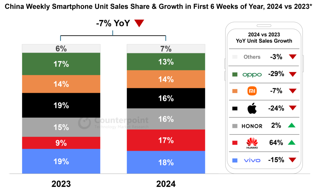 A recent market research study highlights this situation vividly. According to Counterpoint, smartphone sales in China saw a 7% year-over-year drop in the first six weeks of 2024, and Apple and Oppo is facing competition challenges with more than 24% decline. Here are the details…