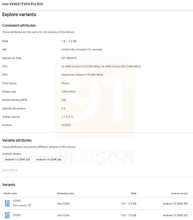 The Google Play Console listing reveals that the Vivo Y200 Pro 5G has a 1,080 x 2,400 display resolution and a 440 DPI screen density. The certification website mentions the SM6375 system on chip. It comprises two Cortex-A78 cores at 2.2GHz and six Cortex-A55 cores at 1.8GHz. There is Adreno 619 GPU onboard. This suggests that the device will be powered by a Snapdragon 695 SoC. The listing also reveals that the device packs 8GB RAM onboard. We can expect more options at launch. The smartphone runs on Android 14 OS out of the box.