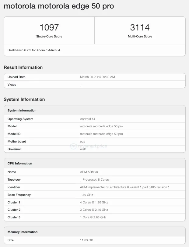 In the Geekbench’s single-core and multi-core test results, the Motorola Edge 50 Pro scored 1,097 and 3,114 points respectively. The benchmarking platform does not reveal any further details of the device.