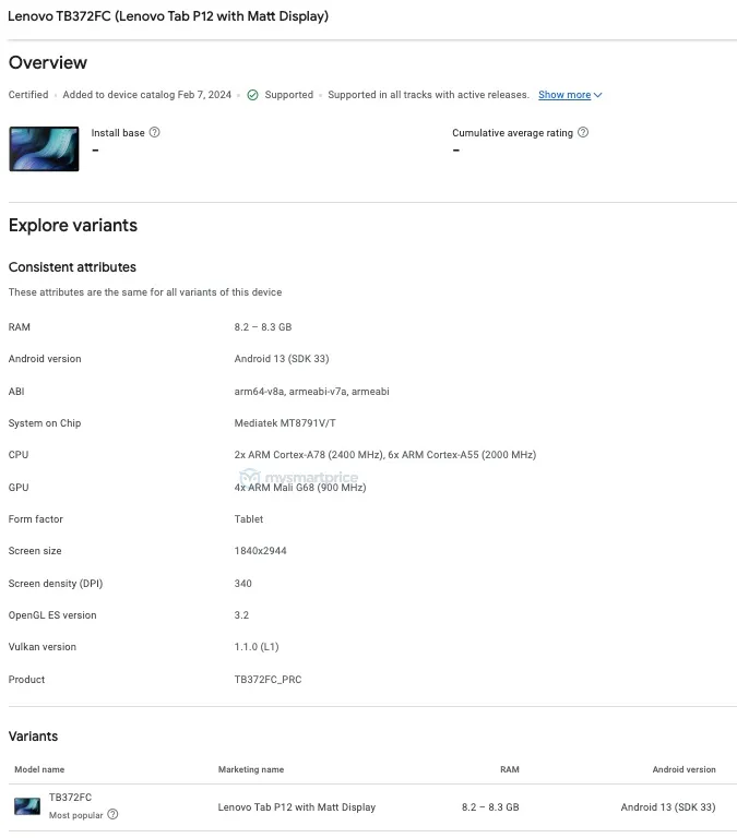 As per the Google Play Console listing (via MySmartPrice), the Lenovo Tab P12 with model number TB372FC. It has a MediaTek Dimensity 7050 SoC under the hood, which is an octa-core chip with four Cortex A78 cores at 2.4GHz, four Cortex A55 cores at 2.0GHz, and an ARM Mali G68 GPU. paired with 8GB of RAM, On the software side, the tablet comes pre-loaded with Android 13, which we can expect to be pretty close to stock.